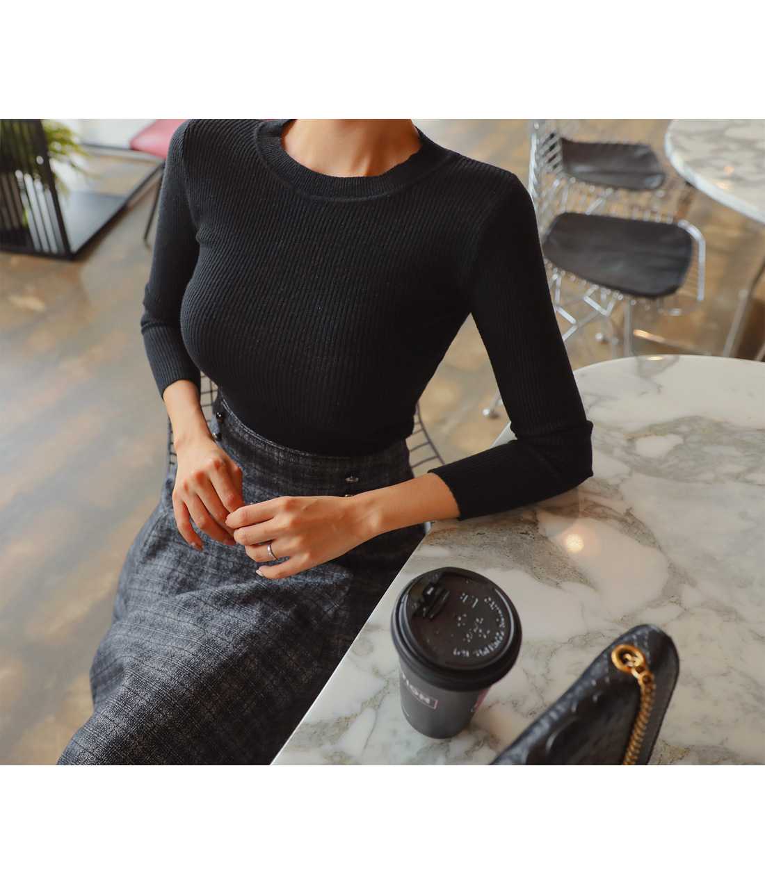 라운드 넥라인으로 슬림핏 니트는 군더더기 없이 깔끔한 디자인에