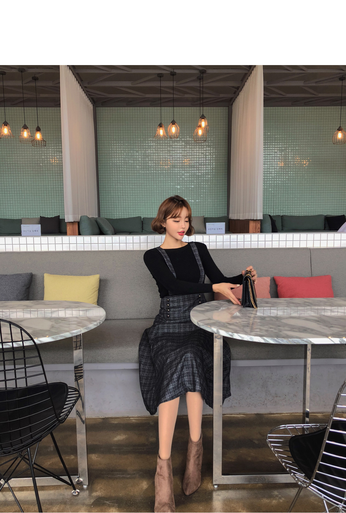 모델이 착용한 것처럼 니트탑과 멜빵 스커트 SET 구성으로