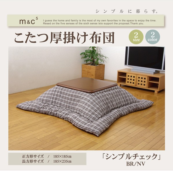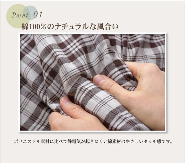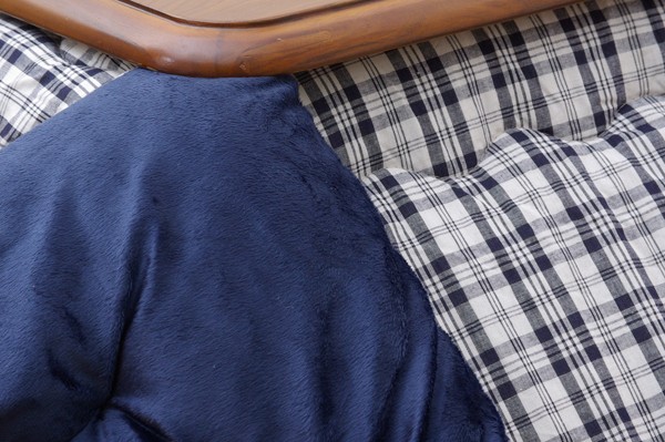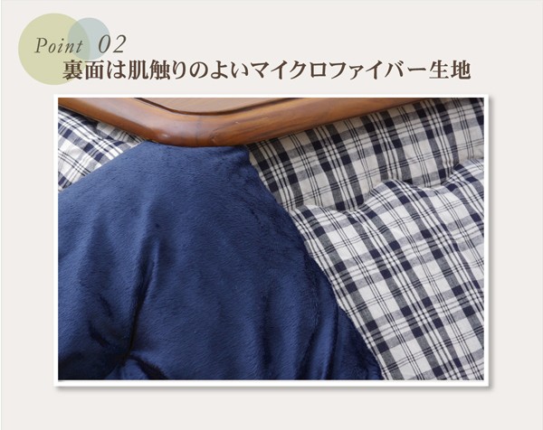 『シンプルでベーシックで素材感のある』をコンセプトに作りました。ベーシックな色目の家具やソファーにに合わせやすい『色』にこだわったコタツ布団です。また、柄も飽きのこない定番のシンプルなチェック柄で仕上げました。表地は綿100%です。綿は繊維の中でも特に肌触りが良いのが特徴です。またポリエステル素材に比べ、静電気が起きにくいとういう特長もあります。肌に直接触れる裏地にはすべすべとした肌感触の短毛生地を使用しています。部分暖房のコタツは電気代もおトクです。