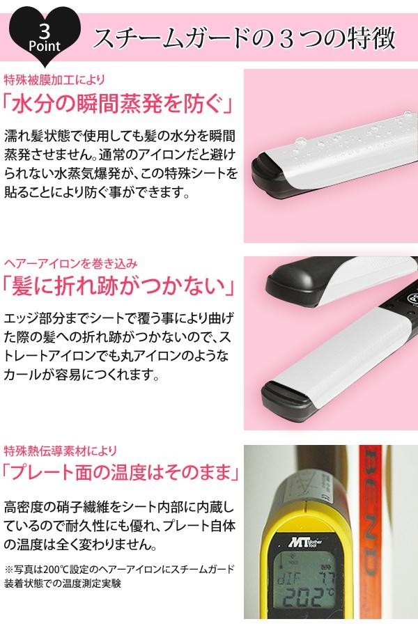 ヘアーアイロンに貼る湿温シールです。特殊熱伝導素材により、プレート面の温度は下げずにそのままの温度に。特殊被膜加工により、水分の瞬間蒸発を防ぎます。また、ヘアーアイロンのエッジ部分まで覆うことで、髪に折れ跡がつきません。※ヘアーアイロンのボディ・プレートの材質によっては塗装、印刷が剥離する場合があります。 |