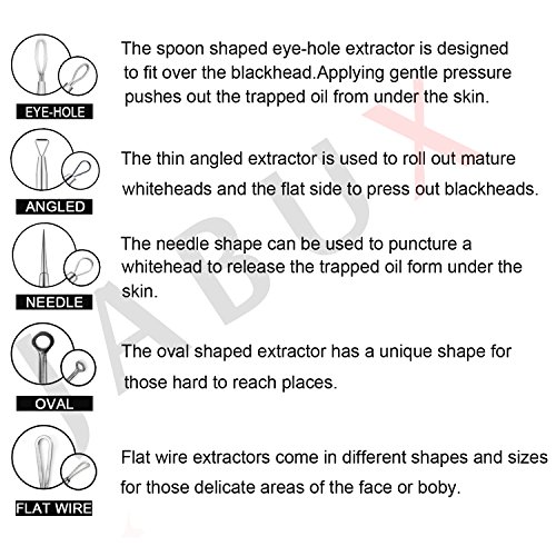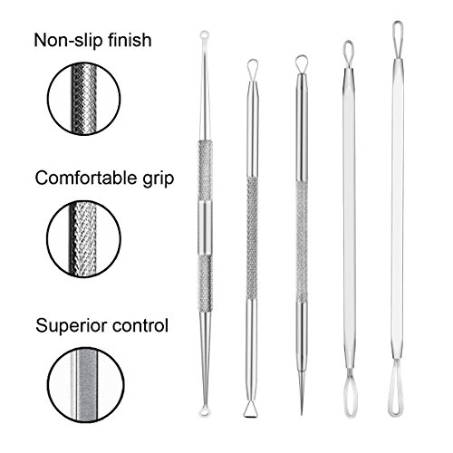 QUALITY STAINLESS STEEL- This is a high quality pure stainless steel blackhead remover which is designed to remove stubborn and deep blackheads effectively. ? EFFECTIVE BLEMISH AND BLACKHEAD REMOVER KIT! These 5 double ended tools allow you to reach blackheads, whiteheads, pimples and blemishes without effort, even in the most difficult spots. Remove blackheads from nose.