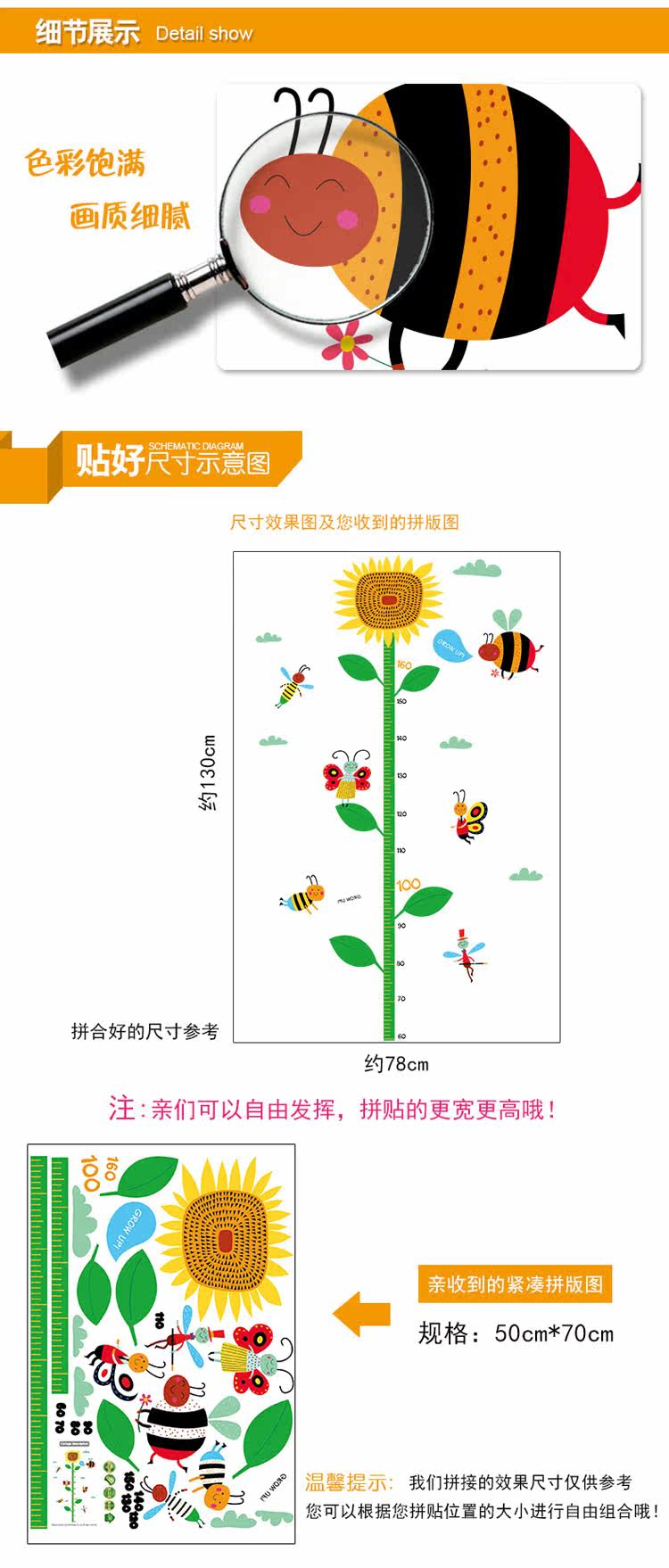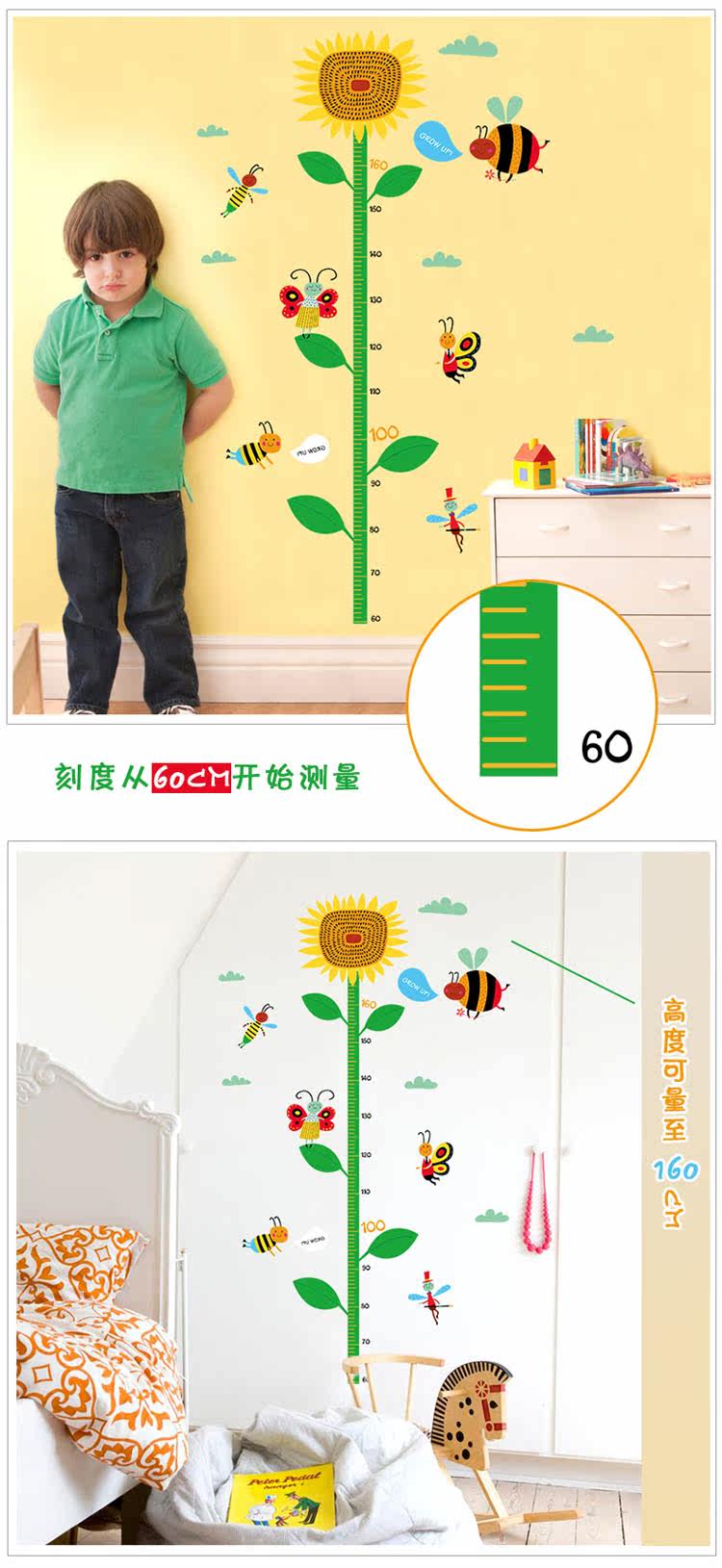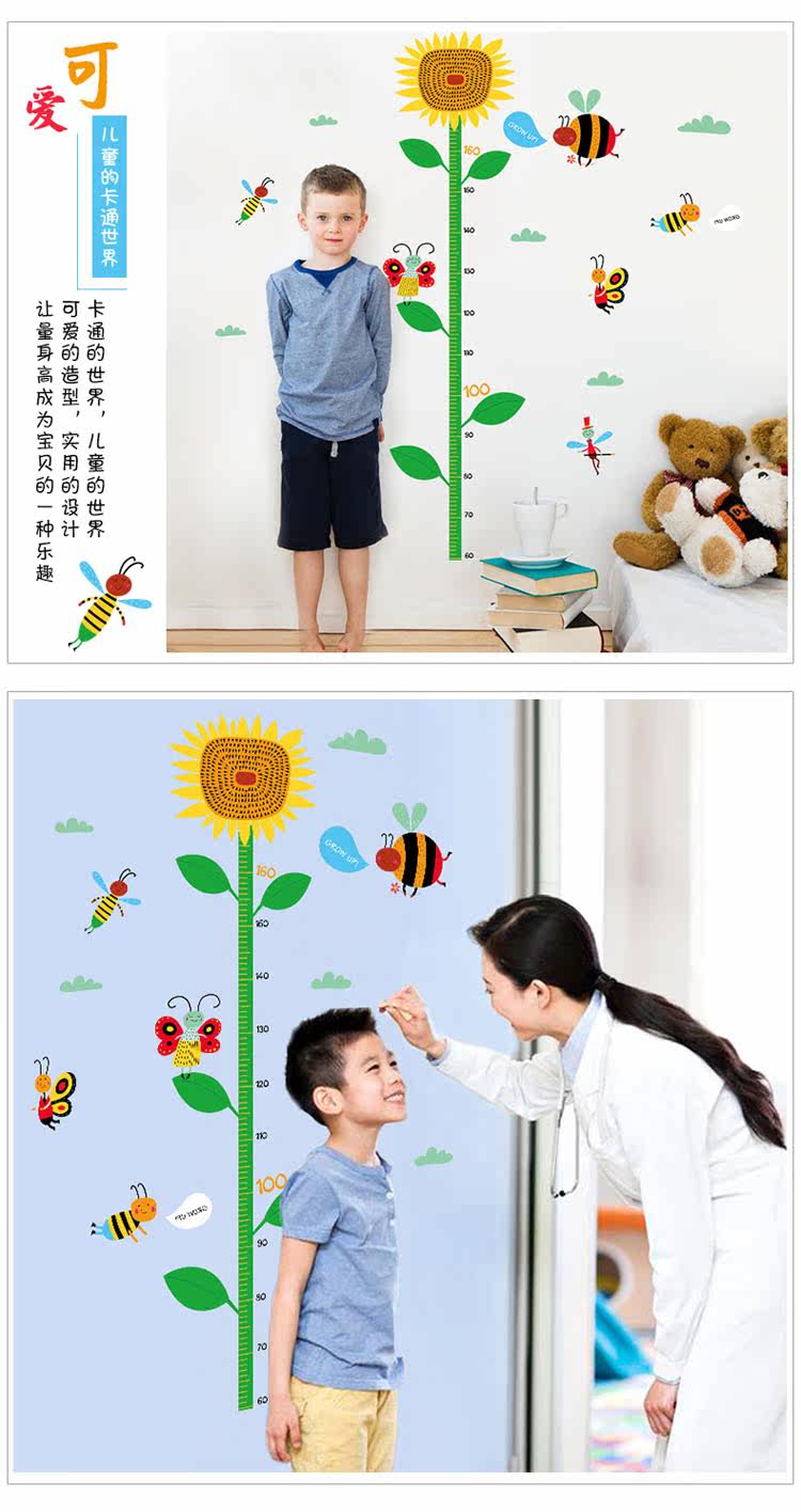 墙贴可移除贴纸 可爱卡通向日葵身高贴 儿童房幼儿园教室装饰