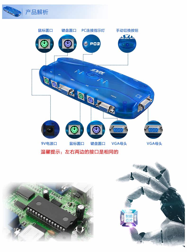 ?切换的时候:因为是PS2的要按顺序开机,就是先切换到1号机器,开机后键盘鼠标可以正常使用后,再切换到2号机 器,开机后键盘鼠标可以正常使用后,才可以来回切换。