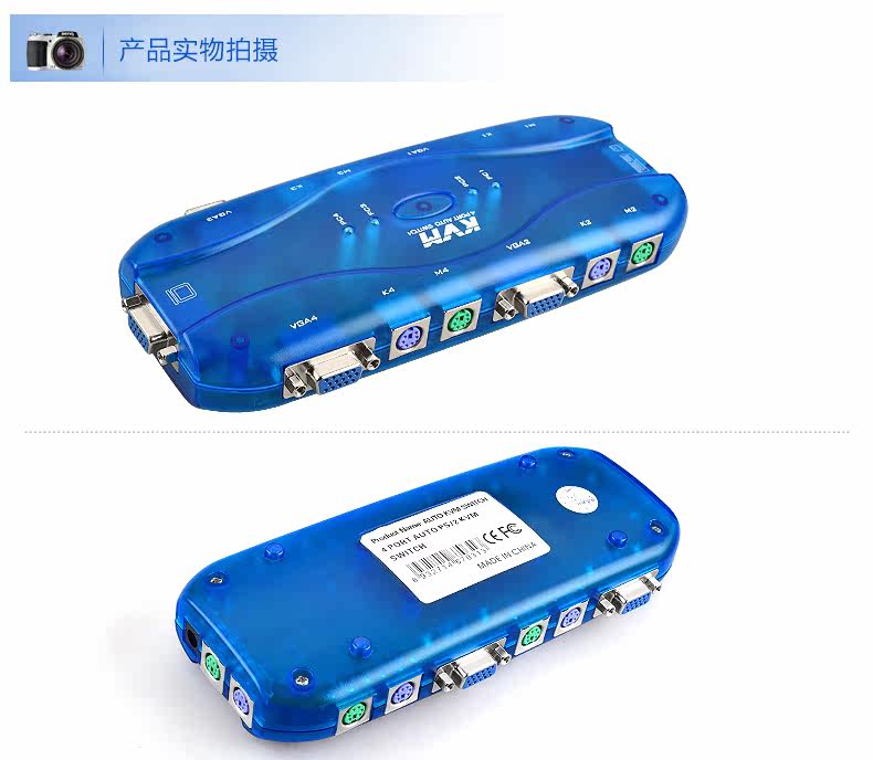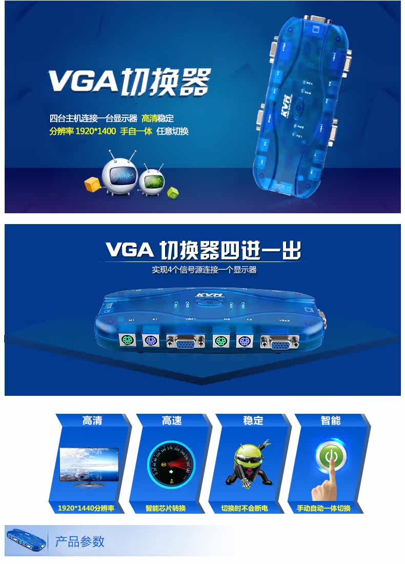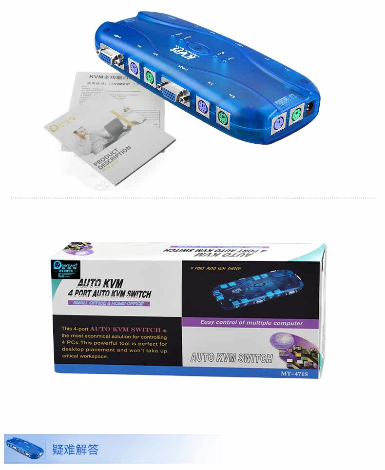 ? ? ? 此产品常用称呼有:VGA分配器、VGA切换器、VGA四进一出、KVM切换器、PS/2切换器、共享器