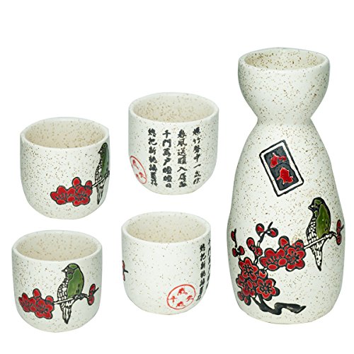 (ISSIKI JAPAN)/Kitchen Dining/Tableware/DIRECT FROM USA/Japanese Sake Set, bottles "Tokkuri" and cup "Ochoko" (UME design, porcelain (set of 5))