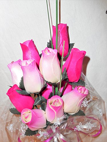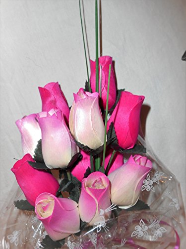 One Dozen Hot Pink and White Wooden Rose Flowers