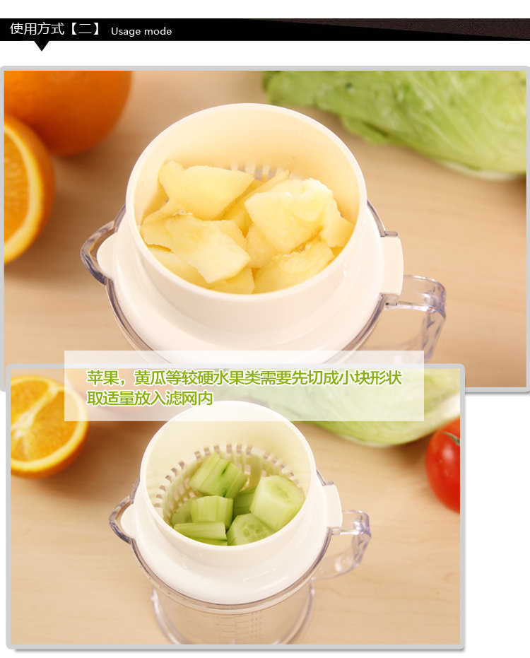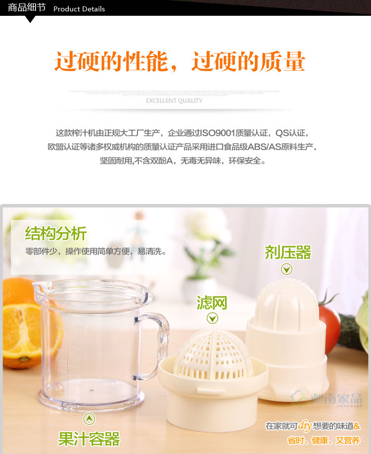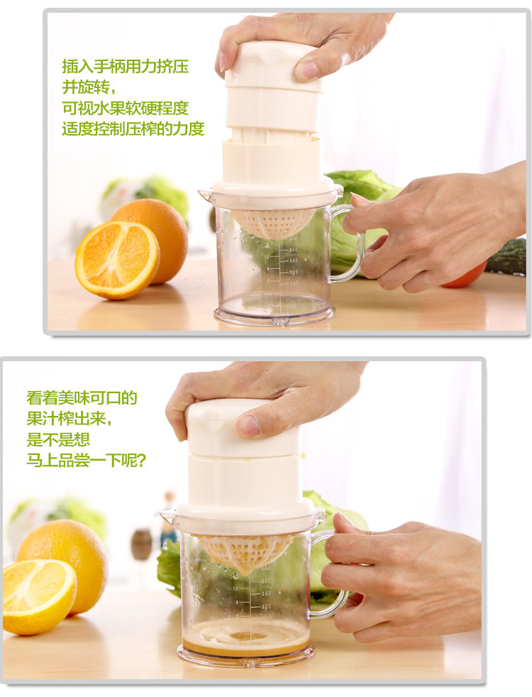 外型新颖,方便清洗且一款俩用,是非常实用的小工具。并可按您的要求榨出各种果汁。