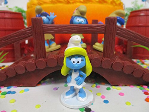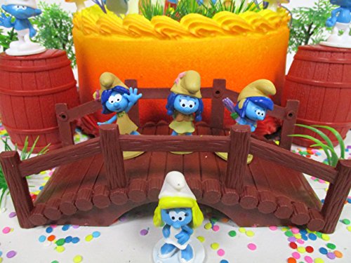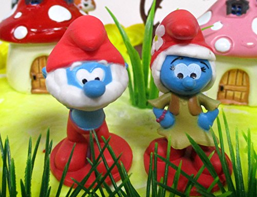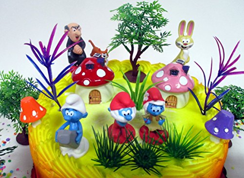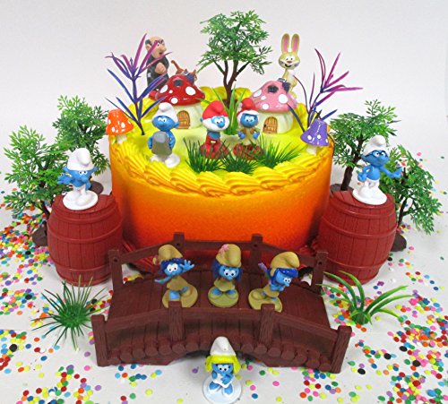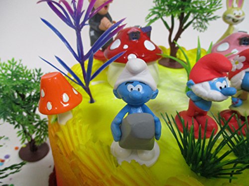 Smurfs and Friends Birthday Cake Topper Set Featuring Smurf Figures and Decorative Themed Accessories