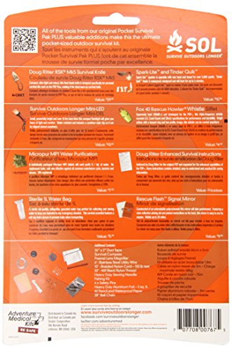 Prepare for any survival scenario with CRKT RSK-MK5 knife, an SOL LED micro-light, Katadyn Micropur MP1 water purification tablets, a 1-liter collapsible water bag, signaling tools, fire-starting tools, and more.