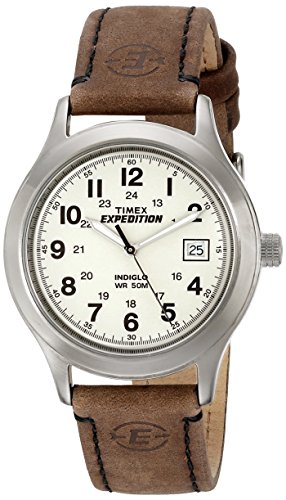 While it looks like a casual watch, the full-sized Timex Men's T40051 Expedition Metal Field Brown Leather Strap Watch adds a stylish yet rugged complement to your everyday wear. It features a large, round silver-tone brass watch case with a flattened, brushed bezel that frames an olive green dial background with Arabic numerals, inset 24-hour notations, large, luminous stick hands (with seconds hand), and a date display at 3 o'clock. With the Quick Date function, you can set the date on the watch without turning the crown for every 24-hour period. Just pull the stem halfway out, and turn until desired date is reached. It also offers an 8-year battery life, water resistance to 165 feet (50 meters), and a durable genuine leather strap. The Indiglo night-light uniformly lights the surface of the watch dial using patented blue electroluminescent lighting technology. It uses less battery power than most other watch illumination systems, enabling your watch battery to last longer.Feature