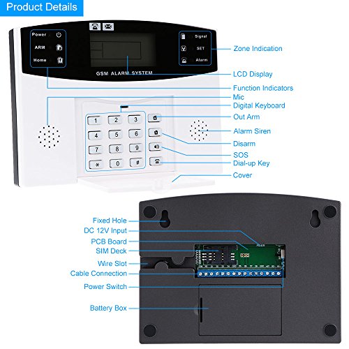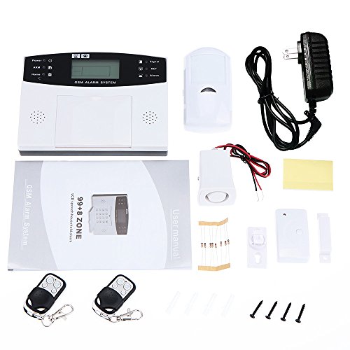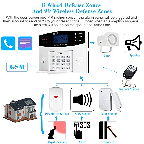 -. Feature : Support SMS and dialing alarm. 8 wired defense zones and 99 wireless defense zones. At most 5 wireless remote control codes. LCD display. Built-in clock. Sound prompt for all operations / SMS prompt automatically about low power of battery. SMS Prompt when AC power lost or and recovered. Can store 6 group of phone numbers and 2 group of SMS numbers. 10-second recording. / Built-in artificial intelligent digital voice announcer. Users can make calls by using keypad on alarm panel, just like a telephone. One-key-control function: Out Arm, Home Arm, Remote Arm. / SOS ,fire, gas, door, hall, window, balcony, and perimeter places alarm. Real-time, delay, 24 hours, bypass defense zones programming function. / Wireless coding, easy to add additional wireless accessories. Remote control arm, disarm, monitor, and intercom by phone. Built-in 7.4V 500mAh rechargeable Battery, make alarm when power off.