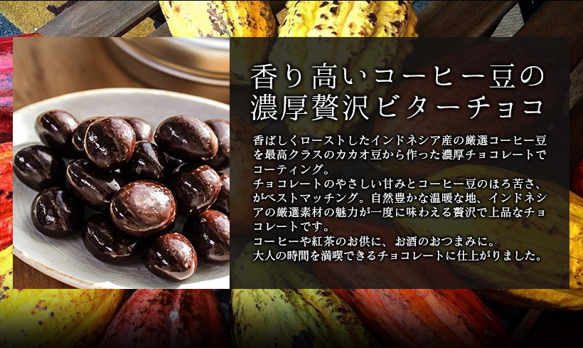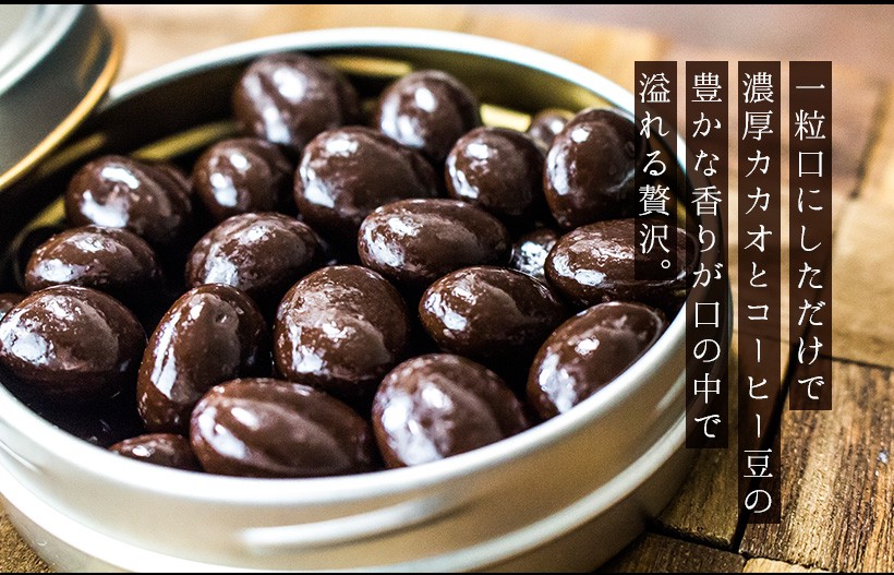 香り高いコーヒー豆1粒ずつをチョコレートでコーティングしております。コーヒーの苦さにマッチするように周りのチョコレートは少し甘めに仕上げました。