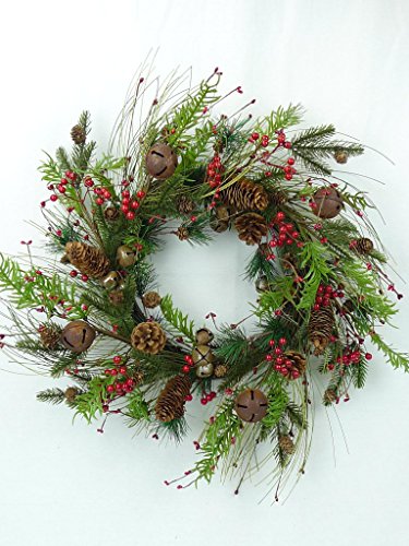 - 24 in Christmas grapevine Wreath with pine, red berries, rusty bells and pinecones
