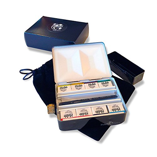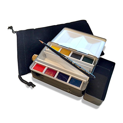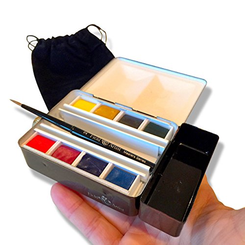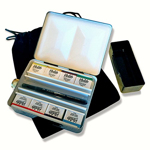 - COMPLETE TRAVEL WATERCOLOR SET - Includes heavy duty metal palette box with built-in flask and cup, 8 Vivido half pan watercolors, a Kolisky size 2 travel brush and a protective velveteen carry pouch