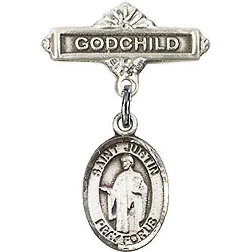 -. Title : Sterling Silver Baby Badge with St. Justin Charm and Godchild Badge Pin 1 X 5/8 inches