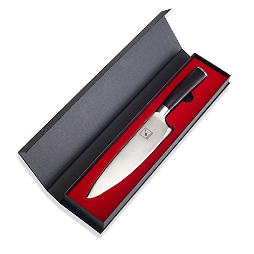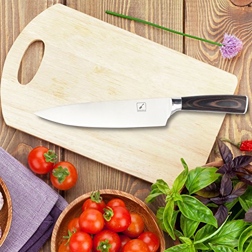 Imarku Professional 8 Inch Chef's Knife for all of your seasonsThe Imarku 8-inch knife is designed for professionals who include chefs, culinary experts, food caterers as well as an ordinary person.It is a multipurpose knife that is ideal for various tasks which include cutting, chopping, dicing and slicing vegetables, fruits, fish, meat and other products. It is also ideal for removing flesh from bones as well as pounding /smashing garlic. The knife is crafted using German engineering and features a toughened stainless steel blade that measures 8-inches. This 2.2-mm thick blade consists of approximately 0.6%-0.75% carbon for added strength and durability. The length of the handle is 5 inches giving the knife an overall length of 13 inches. To ensure the knife is resistant against rust/corrosion and won't rust, the steel blade also consists of 16-18% chrome material.