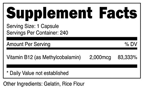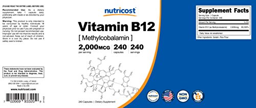 Nutricost's Vitamin B12 provides 2000 mcg of Vitamin B12 per capsule and 240 Capsules per bottle. Nutricost products are guaranteed for quality and purity! Vitamin B-12 is a water soluble vitamin necessary for the maintenance of a healthy nervous system and for the metabolic utilization of fats and proteins. Nutricost Vitamin B12 is Non-GMO, Gluten Free and Proudly made in the USA.Feature