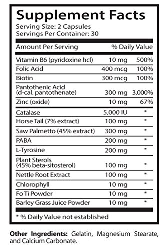 - Feature : ANTI GRAY HAIR: Is made with all natural ingredients that include - Vitamin B6, Folic Acid, Biotin, Pantothenic Acid, Zinc, Catalase, Horse Tail extract. Saw Palmetto, PABA, L-Tyrosine, Plant Sterols, Nettle Root Extract, Chlorophyll, Fo Ti Powder, Barley Grass Juice Powder. / OUR ANTI GRAY HAIR FORMULA: Made of all natural and high quality ingredients which are essential hair health nutrients. This unique Natural formula may help you to restore hair color and prevent hair follicles from loosing melanin enzyme. Works for women and men and effective for all hair types. / ANTI GRAY HAIR SUPPLEMENT WITH CATALASE: A simple, but powerful enzyme, catalase, has been found to be the culprit for causing gray hair. Catalase enzyme production declines with age, preventing hair follicles from producing melanin. In essence, catalase deficiency allows hydrogen peroxide build-up, bleaching our hair to gray then white. / ANTI GRAY SUPPLEMENT WITH PABA: PABA is a B vitamin-like nutrient that is often found in hair health supplements. An independent online vitamin resource lists PABA as a hair health nutrient and explains that PABA has been shown to restore hair color in some of the first studies of vitamins and hair color restoration. / GUARANTEED 100% SATISFACTION (3 Bottles - 180 Capsules) MADE IN U.S.A. No Additives or Fillers, Zero Artificial Ingredients. In addition, our formula is made in FDA approved facility and conformed by GMP standards.