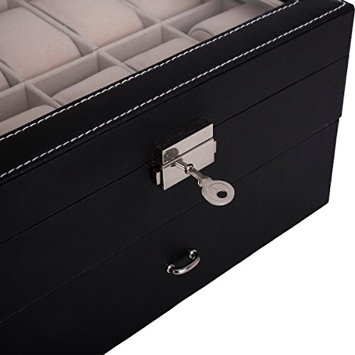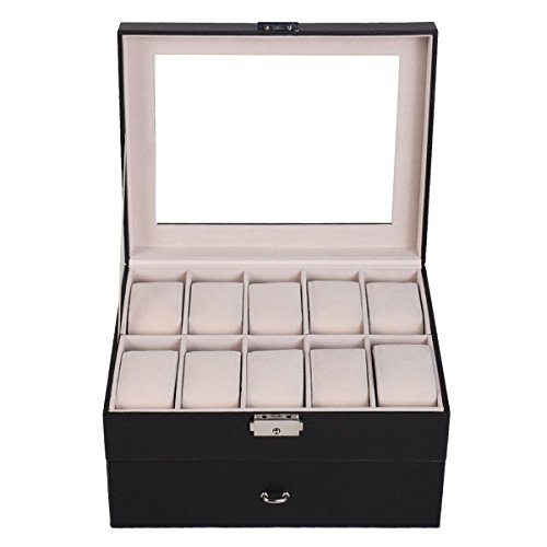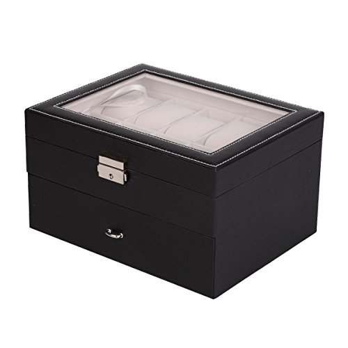 -. Binding : Kitchen -. Brand : By Choice Products -. EAN : 0692278711131 -. Feature : Color: Black Box Size: 10"x8"x6"(L x W x H) / Removable Pillows Size: About 3"x1.6"x1.3"(L x W x H) Glass Top Window Size: 8"x 6"(L x W ) Slots Size: 3.6"x1.8"x1.4"(L x W x Depth) / Box Material: PU Leather(Surface) + Wood + Pearl Fleece Lining (Inside) Weight: 6lbs / Package include: 1 x Double Levels Slots Watch Box 2 x 10 Removable Pillows 1x Silvery Key -. IsAutographed : 0 -. ProductGroup : Home -. ProductTypeName : HOME -. Title : Large 20 Slot Leather Watch Box Display Case Organizer Glass Top Jewelry Storage - By Choice Products -. UPC : 692278711131