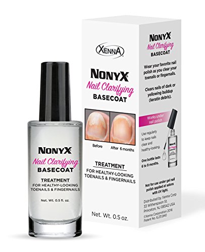 -. Binding : Misc. -. Brand : Xenna -. Color : white -. EAN : 0812634000031 -. Feature : Now you can have clear, healthy-looking toenails and fingernails in 3-9 months! / Special clarifying basecoat clears nails by removing discoloring keratin debris build up, and works under any nail polish*. / Paraben & preservative-free formula works on women AND men's nails, and is even safe for use by diabetics. / One bottle is a 6-9 month supply. Made in USA. / *Not recommended for use under gel polish dried with UV light. -. IsAdultProduct : 0 -. Label : XENNA CORPORATION -. Manufacturer : XENNA CORPORATION -. MPN : B01KY68QA0 -. NumberOfItems : 1 -. PackageQuantity : 1 -. PartNumber : B01KY68QA0 -. ProductGroup : Beauty -. ProductTypeName : BEAUTY -. Publisher : XENNA CORPORATION -. Studio : XENNA CORPORATION -. Title : Nonyx Base Coat Nail Treatment Kit For Clear Toe & Fingernails In 3-9 Months -. UPC : 812634000031