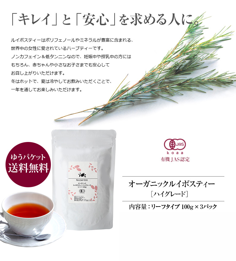 店長が自信を持ってオススメします。有機JAS商品なのに、送料無料でペットボトル1本分がなんと7円!がぶのみできる安さなのです。茶葉は完全オーガニックなので安心・安全♪ 女性や子どもに嬉しいノンカフェイン・低タンニン。もちろん、フラボノイドもたっぷり。自然な甘みとすっきりした味わいの世界的に人気のあるお茶です。