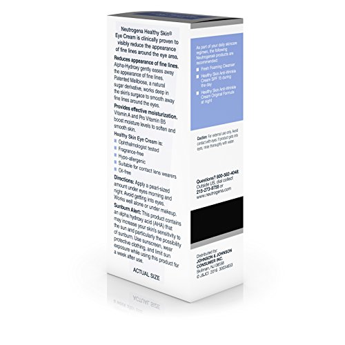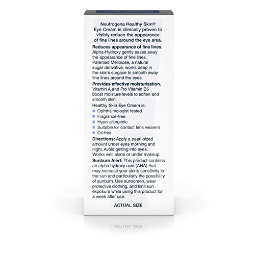 Help improve the signs of aging with Neutrogena Healthy Skin Eye Cream. This ophthalmologist-tested eye cream is clinically proven to visibly help reduce the appearance of fine lines and increase firmness around the eye area. It is formulated with alpha hydroxy acid to help ease away the appearance of fine lines. The hypoallergenic formula contains Vitamin A and Pro-Vitamin B5 to boost moisture levels to soften and smooth skin. Optical light diffusers help diminish the appearance of dark circles, while skin soothers help calm the eye area and reduce puffiness. This fragrance-free eye cream is suitable for contact lens wearers.Feature