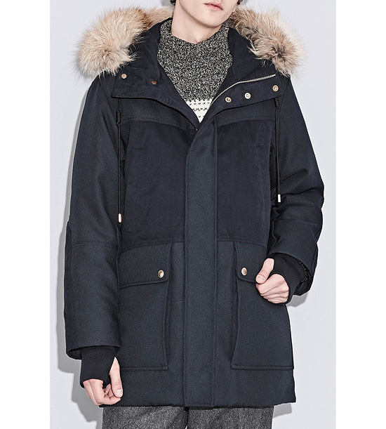 - 조직감있는 화섬과 몰스킨 기모원단을 믹스하여 제안하는 블럭킹 디자인.