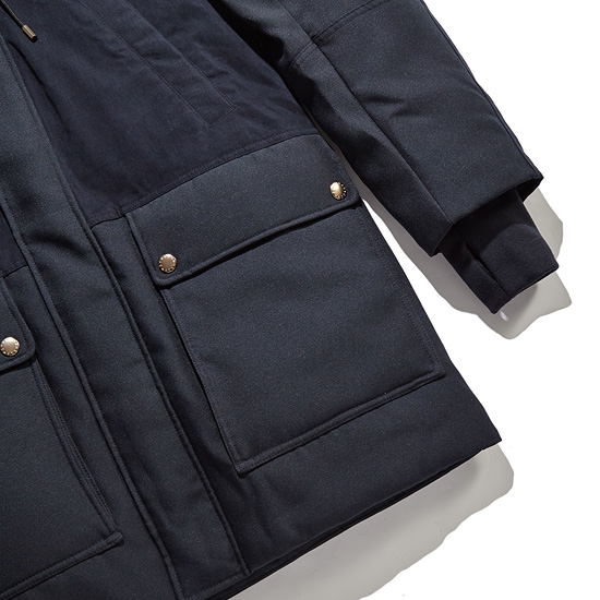- 사파리형 스타일의 힙을 덮는 중간 기장 헤비 구스 다운 점퍼.