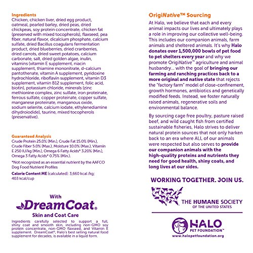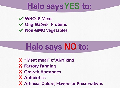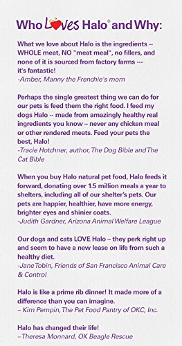 Halo uses real WHOLE meat, poultry, or fish, and NO "meat meal" of ANY kind in our natural dog food. Halo dog food is now made with Dream Coat Skin and Coat Care from non-GMO plant sources and Vitamin E—to support healthy skin and shiny coat. We also have dog food options for special diets, including puppy food, small breed dog food, vegan dog food, senior dog food, and grain free dog food. At Halo, WHOLE Makes a Whole Lot of Difference is the philosophy that drives our holistic approach to ingredient sourcing, recipes, nutritional value, the welfare of ALL animals, and our overall mission to change the way companion animals are fed and farm animals are raised…for the better!Feature