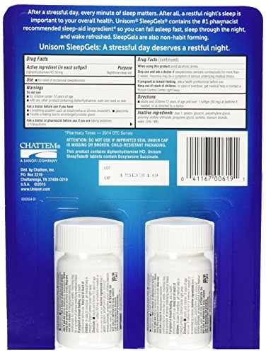 Hectic day? Try sleep gels at night you've had a rough day, and you need a relaxing night's sleep. But the thought of taking a sleeping pill makes you stress out even more. Relax. Unisom sleep gels help you fall asleep fast and wake up energized. The liquid-filled soft gels leave no chalky taste behind like some other pills and are proven to be safe and non-habit forming. With the help of the #1 pharmacist recommended sleep-aid ingredient,1 unisom sleep gels reduce your natural urge to stay awake. You not only fall asleep faster, you also sleep soundly.