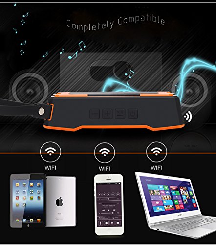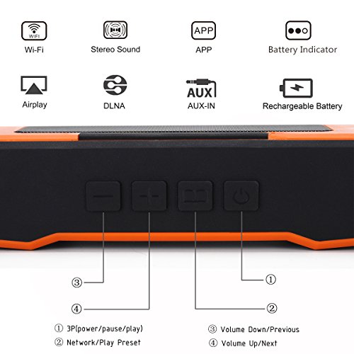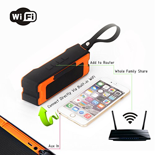 -. Feature : 1.Multi-choices of connection, Connect via direct Wi-Fi, Wi-Fi router, or AUX. Built-in WiFi is more compatible than Bluetooth, Via Wi-Fi router speaker can be shared by multi-devices at any room within the range of Wi-Fi, eight connections simultaneously. / 2.Awesome Hi-Fi Stereo Sound provide by dual high-performance acoustic drivers. Compared to Bluetooth speaker, the newest Wi-Fi technology can guarantee bandwidth up to 150Mbps, stream music without sound loss, giving you crystal clear lossless Sound. / 3.Powerful Wi-Fi function and superb compatibility. Support internet radio and online streaming music services like Spotify, , iHeartradio, and Titdal. Apps Via Air Play, DLNA and Q Play multimedia protocols to achieve. / 4.Incredible Mobility and Usability. High waterproof rating IPX6, allow been used from bathroom to beach. Rubberized coating and solid structure make it shockproof and dustproof. Ultra-portable under 15 ounces with small size (7*1.8*2 inches). / 5.Excellent battery capacity with 4500 mA rechargeable lithium battery, play last at least 6 hours. Dual stereo Speaker with 4Ω 5*2 W. Stylish Multi-colors (yellow, orange, green and blue) available.