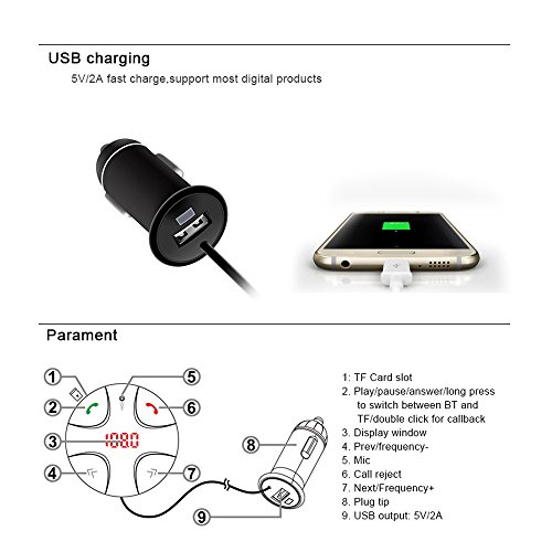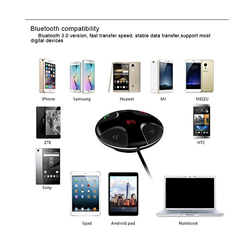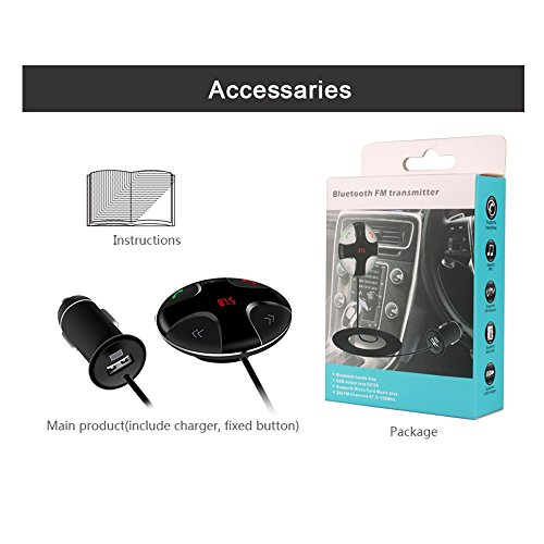 Instructions for use: Step1. Plug the FM transmitter into your vehicle's cigarette lighter or power port Step2. Tune your radio to an unused FM frequency , then match the FM transmitter and car FM radio at same frequency Step3. Please Make sure the Bluetooth feature on your device is turned on and is connected