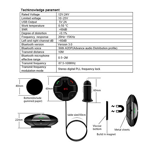 Specification: 1. Rated Voltage: 12V-24V 2. Limited voltage: 10~25V 3. USB Output: 5V 2A 4. Work temperature: 0-50 5. SNR: >60dB 6. Degree of distortion: <0.1% 7. Frequency response: 20Hz-15KHz 8. Left and right channel dB: >60dB 9. Bluetooth version: Version 3.0 10. Bluetooth voice: With A2DP(Advance audio Distribution profile) 11. Transmit distance: 10M 12. Bluetooth microphone effective range: 0.5-2M 13. Transmit frequency: 87.5-108MHz 14. Transmit frequency modulation mode: Stereo digital PLL frequency lock