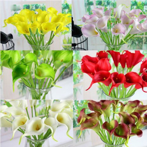 - Feature : Description: Artificial Latex Calla Lily Flowers, well made and vibrantly colored, looks like real. Ideal for placing in a vase, filling of centerpieces or home wedding decoration. Package Included: 1 Bunch X Artificial Flower (10 Pcs) Features: Materal: Textile and Plastic Color: Green,Red, Sunset Red,Pink,Yellow,White Bouquet Size: Appr. 21cmx9cm /8.26''x3.54" Flower Diameter: Appr. 2cm/0.78'' Flower Quantity:10/bunch Other size pls refer to the following picture Notice: 1.Please allow 1-3m / m error due to manual measurement. Pls make sure you do not mind before you bid. 2.The colors may have different as the difference display,pls understand.
