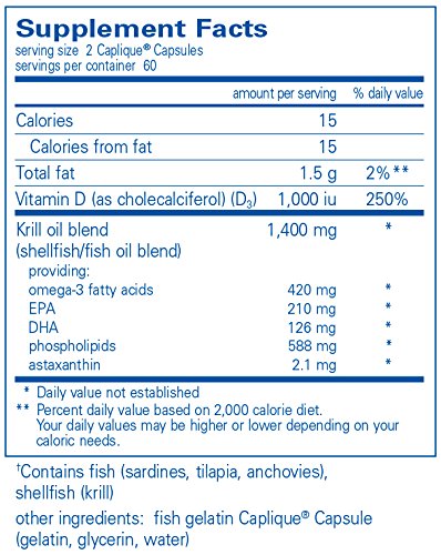 UltraKrill+D provides a powerful, activated omega-3 blend with the following key distinctions: EPA/DHA bound to phospholipids, EPA/DHA bound to triglycerides 588 mg phospholipids per serving, 2.1 mg astaxanthin per serving for enhanced omega-3 stability, 1,000 iu Vitamin D3, Odorless, nitrogen-preserved Caplique® Capsules. EPA and DHA bound to phospholipids, as found naturally in krill, allows for increased bioavailability of EPA and DHA. Phospholipids provide enhanced transport of fatty acids into cells. This efficiency means less EPA and DHA are required per serving to provide omega-3 health benefits. UltraKrill+D provides 588 mg phospholipids, 210 mg EPA and 126mg DHA per serving.Feature