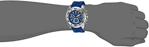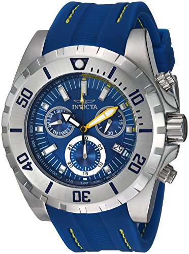 Invicta 24920 Pro Diver chronograph men's watch features a 52mm wide and 16mm thick solid stainless steel case with a unidirectional rotating bezel and textured push-pull crown with function pushers. Invicta 24920 is powered by Swiss Ronda Z60 quartz chronograph movement. This stylish watch also features a sharp looking navy blue dial with white accents black and yellow luminous hands and index hour markers along with the chronograph and day-date display functions, scratch resistant flame fusion crystal and water resistant to 100 meters. Invicta 24920 is equipped with a 26mm wide yellow stitched blue polyurethane rubber strap with a buckle clasp. Invicta 24920 men's Pro Diver chronograph navy blue dial blue polyurethane strap watch is brand new and comes in an original Invicta gift box and is backed by a 5 year limited warranty.Feature