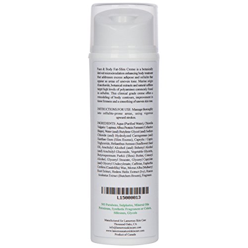 -. Feature : REGAIN YOUR YOUTHFUL LOOKS - Advanced 3 in 1 natural face and body formulation, engineered in our labs for optimal results. Significantly improves the unwanted appearance of cellulite, tightening and renewing your looks by means of natural resources - application after application. It helps to reduce fat and firm the skin around the abs, arms, knees, thighs and gluteus, leaving you look fitter, healthier and more attractive in the short and long term / REFRESHINGLY SLIM - Our plant-based facial and body anti-cellulite slimming creme reduces your double chin and eye bags, rewarding you with a fresher and slimmer look. Your face and neck become tighter and toned. Can be mixed with other LamorosA products like Neck & Decollete Rejuvenating Creme and Eye & Lip Firming Serum for optimal results without worrying about side effects. CONTAINS CAFFEINE: SHOULD NOT BE USED BY PREGNANT OR NURSING WOMEN / 100% ALL-NATURAL, CRUELTY FREE, VEGAN & NON-TOXIC - Our specially selected plant-based active ingredients do not contain any Parabens, Sulphates, Mineral oils, Petroleum, Synthetic Fragrances, Colors, Silicones, Glycols, or any harsh chemicals like so many other products. Our creme was made from caffeine, ivy, and red seaweed. / RICH & DESIGNED FOR YOUR SKIN TYPE - Our Face & Body Fat-Slim Creme is very rich and the skin absorbs the ingredients quickly, a little goes a long way, saving your wallet while giving you maximum results. If you only apply this creme on your face twice a day, it may last 2 to 3 months. If you only apply it on your body twice a day, it may last about 2 months. Gentle smell and safe for all skin types, whether you have an oily, dry or sensitive type / MADE IN NORTH AMERICA - 100% RISK FREE GUARANTEE - At LamorosA, we believe in our superior, domestically made products, which is why we don't hesitate to offer you a Money Back Guarantee on all of our products. If you are not satisfied with our products for any reason, just contact us for a full refund, quick and no questions asked. All our products are created with a holistic mindset and made with love
