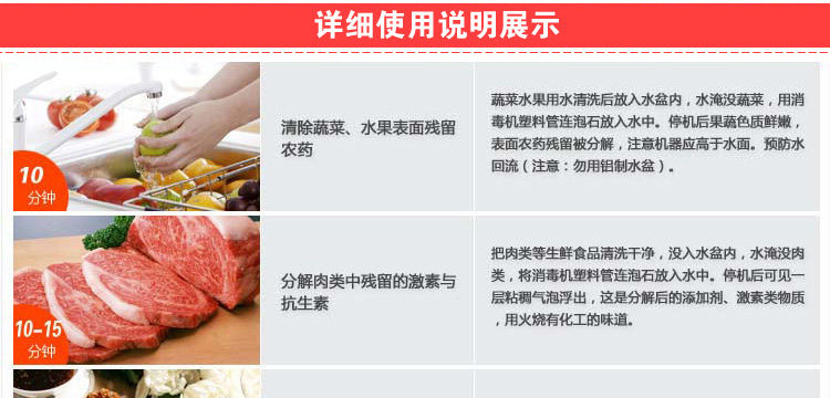 1, food purification: from the table and the degradation of fruits and vegetables, food residues in the fertilizer, pesticides and other toxic substances, remove meat, eggs, antibiotics, chemical additives, hormones and other harmful substances, kill seafood easy to poisoning halophilic Of bacteria, the disease from the mouth of the entry.