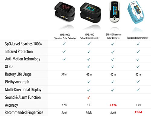 The Acc U Rate® CMS 500D Generation 2 Pulse Oximeter is the Deluxe version of our Acc U Rate® line of pulse oximeters. It shows your measured SpO2 and pulse rate on a high quality OLED screen (with six multidirectional display choices) and features an additional plethysmograph that measures your pulse strength.What is a plethysmograph?