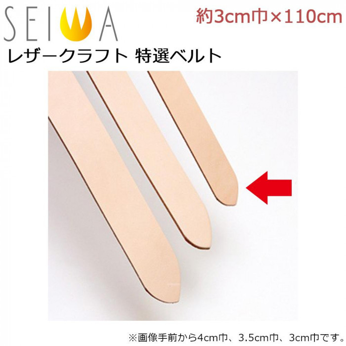 先端がベルトとしてすぐ使える形に切り出してあります。刻印、染色ともにキレイに入るので、自由にカスタマイズしてオリジナルのベルトをお作りいただけます。 製造国:日本 素材・材質:牛革 商品サイズ:約3cm巾×110cm、厚さ3mm セット内容:1本入り ※サプライヤー直送品 ご注文後7~8営業日後の出荷となります【商品名】誠和(SEIWA/セイワ) レザークラフト 特選ベルト 約3cm巾×110cm