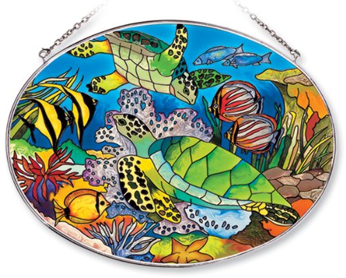 Amia Oval Suncatcher with Turtle and Tropical Fish Design, Hand Painted Glass, 6-1/2-Inch by 9-Inch