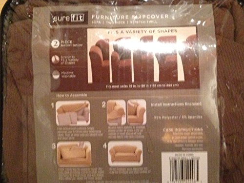 -. Binding : Kitchen -. Brand : Surefit -. Color : Brown -. Feature : 2 Piece Sofa Slipcoer / Mocha Brown / Stretch to fit various shapes / Machine washable / 95% Polyester and 5% Spandex -. ProductGroup : Home -. ProductTypeName : HOME -. Title : Sure Fit Furniture 2 Piece Sofa Slipcover Stretch Twill in Mocha Brown