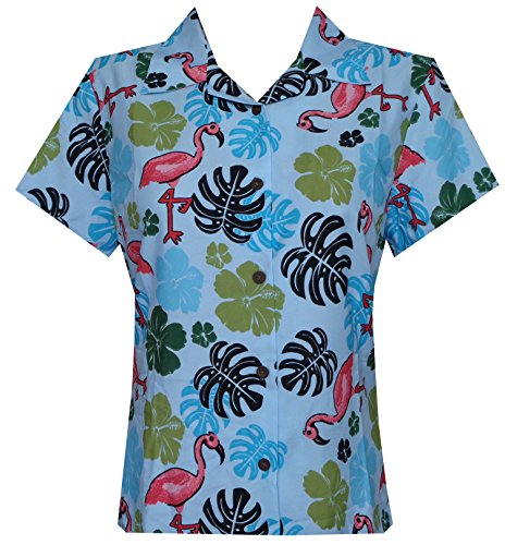Hawaiian Shirt 37W Women Flamingo Leaf Print Aloha Beach Blouse Aqua Blue S