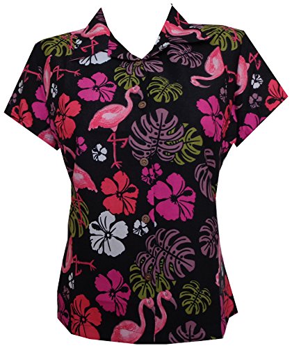 Hawaiian Shirt 37W Women Flamingo Leaf Print Aloha Beach Blouse Black L