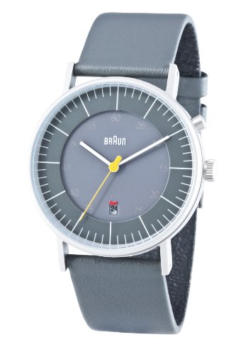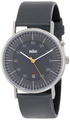-. Binding : Watch -. Brand : Braun -. Department : mens -. EAN : 5013348607423 -. Feature : Round watch featuring stick indices, seconds indicators at inner dial, and date window at 6 o'clock / 38 mm stainless steel case with mineral dial window / Quartz movement with analog display / Leather calfskin band with buckle closure / Water resistant to 50 m (165 ft): In general, suitable for short periods of recreational swimming, but not diving or snorkeling -. Label : Braun -. Manufacturer : Braun -. Model : BN0013GYGYG -. MPN : BN0013GYGYG -. NumberOfItems : 1 -. PackageQuantity : 1 -. PartNumber : BN0013GYGYG -. ProductGroup : Watch -. ProductTypeName : WATCH -. Publisher : Braun -. Studio : Braun -. Title : Braun Men's BN0013GYGYG Classic Calendar Grey Stainless Steel Watch