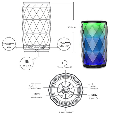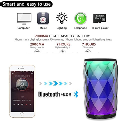 ★ MULTIFUNCTION - Color changing LED light + Bluetooth play function + Micro SD card and TF card play function + USB sound card function + Wireless bluetooth with 3.5mm audio cable. It also supports speakerphone hands-free feature.