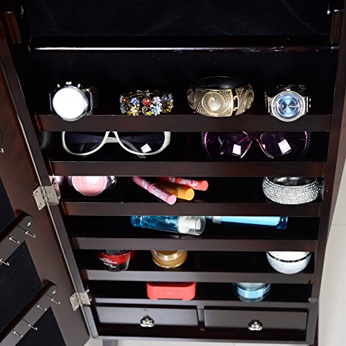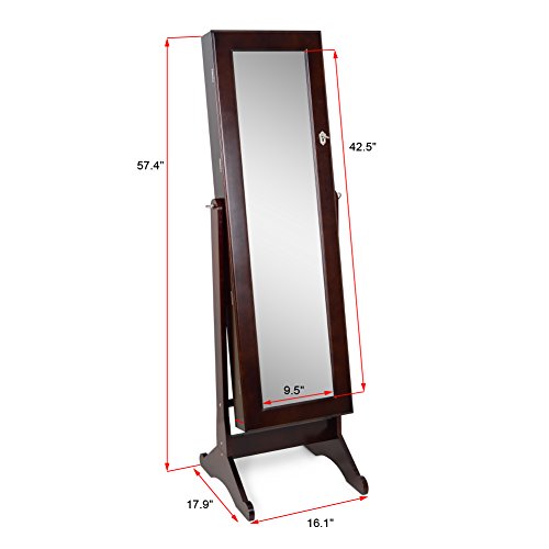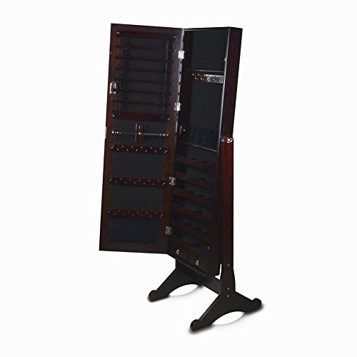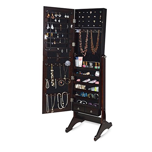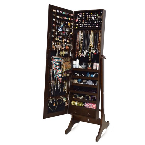 This stylish piece of Jewelry Armoire is great for ladies that love their jewelry displayed in a classy way. It makes it easy to choose your beauty jewelry in the morning without the frustration of looking for loose/missing pieces. It stores all of your jewelry safely with lock and in a organized manner. It features an elegant, space-saving design MDF wood construction, large size full length mirror and 2 small drawers.