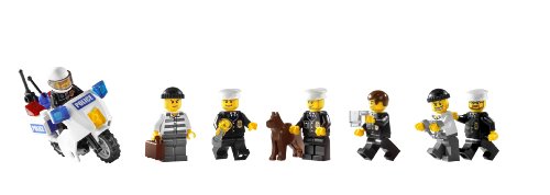 -. Feature : The whole Police Station is on alert to catch escaped P.R.Isoners, When you catch the robbers, throw them back into jail / Set has lots of realistic details, including gates that open, spotlights on roof, command base tower, garage doors that slide open and more / Set includes 2 P.R.Ison cells with toilets and beds, keys hanging outside the P.R.Ison cells, and even handcuffs to put on the P.R.Isoners / Police Headquarters has rooms for interrogation, a coffee break, computer work and a refrigerator with water cooler / Includes police headquarters, P.R.Ison transport truck, car and motorcycle / This fun set can be divided in two and arranged however you like it / Contains 953 pieces / This set also includes 7 minifigures and 3 police vehicles / Stands over 10" tall and has a 15" x 10" base / But be careful not to let the P.R.Isoners escape through the trick walls
