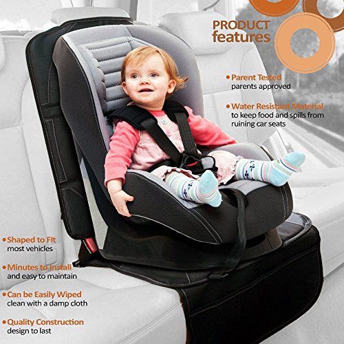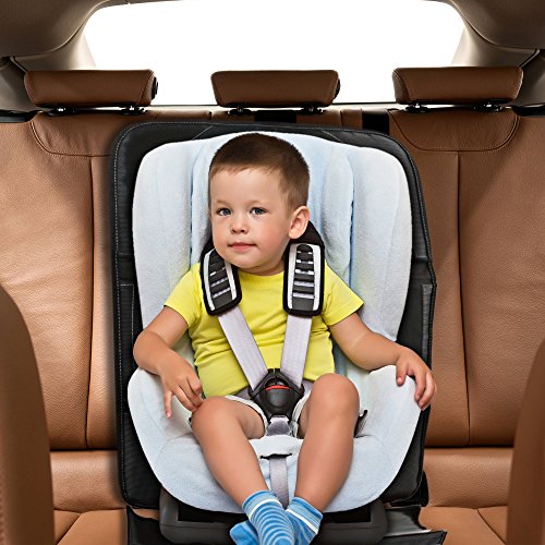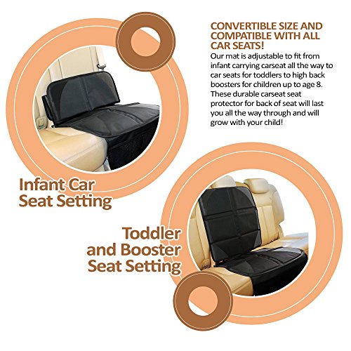 ? CONVERTIBLE SIZE AND COMPATIBLE WITH ALL CAR SEATS! Our mat is adjustable to fit from infant carrying carseat all the way to car seats for toddlers to high back boosters for children up to age 8. These durable carseat seat protector for back of seat will last you all the way through and will grow with your child! Tested to work well with all brands of carseats such as Britax and Chicco.