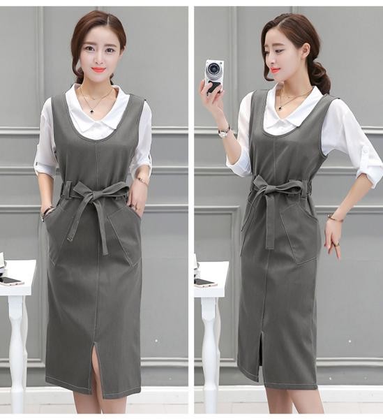 カジュアル☆長袖シャツ 白ブラウス ミモレ丈 ジャンパースカート セットアップ